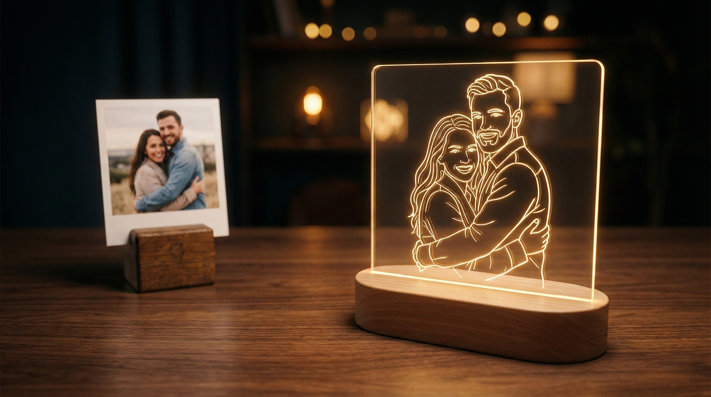 Turn your favourite photo into elegant line art—laser-engraved on crystal-clear acrylic and set in solid wood, softly glowing day and night.